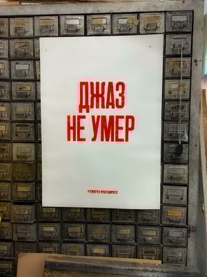 Double-sided poster. One side says “Jazz died,” the opposite says “Jazz died not.” Written in the Russian language. The edition is limited to 15 copies, of which 10 are distributed by us, and 5 by Demon Press/Partisan Press in Russia.
